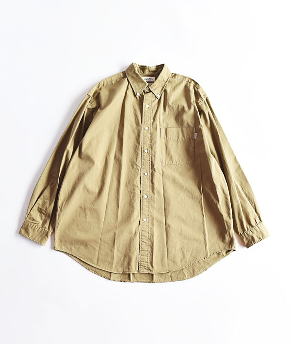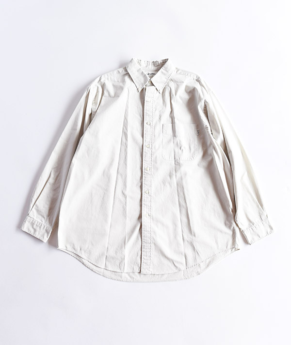 バイオウォッシュを施してアタリを出したコットンツイル素材を使用。ビンテージ感のあるラフな風合いが特徴のビッグシルエットのボタンダウンシャツ。衿やカフスに薄いフラシ芯を内蔵させた柔らかな仕上がり。スタンダードで癖のないデザインで、一枚での着用はもちろん、レイヤードスタイルにも活躍します。胸ポケットにはビスネームを施しています。