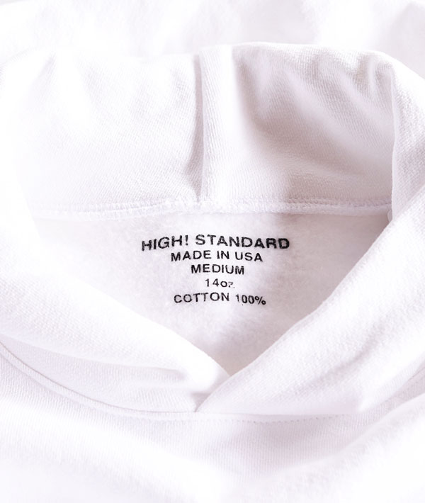 Made in USAのHIGH!STANDARDオリジナルプルオーバースウェットフーディー。 14オンスと非常に厚手で重みのあるスウェット生地を使用。肉厚で非常に暖かく、洗いによる縮みもほとんどありません。 すべての工程をアメリカの熟練された職人たちの手で行っており、内側ネック部分にプリントされたロゴもポイントになっています。身幅にゆとりがあり、着丈が短めのシルエットでアメリカンベーシックを感じさせるアイテムです。