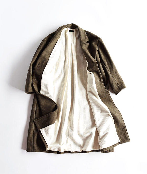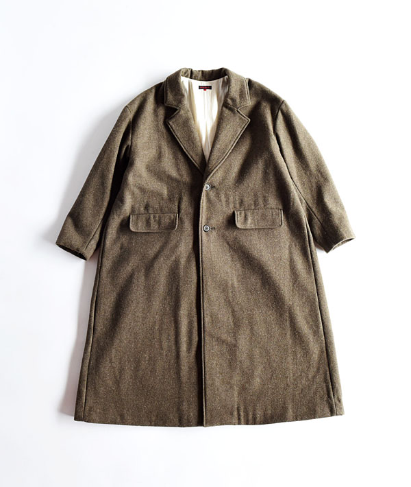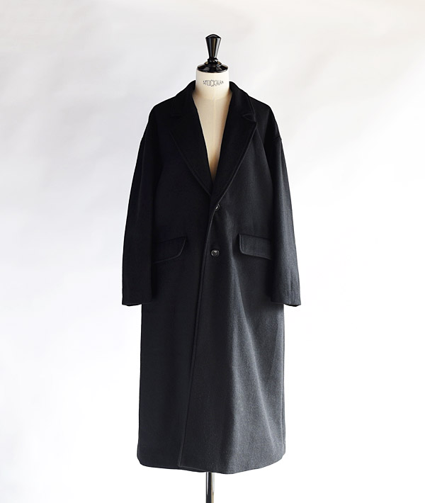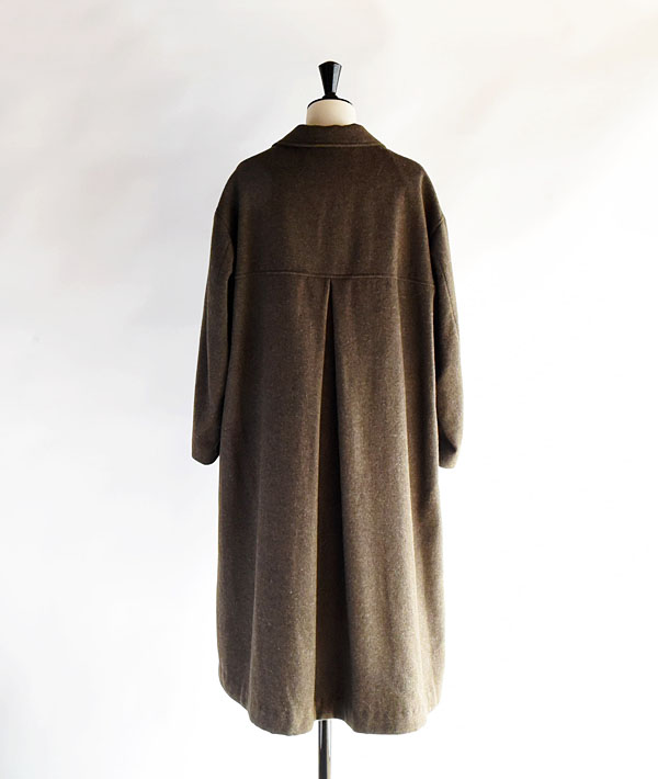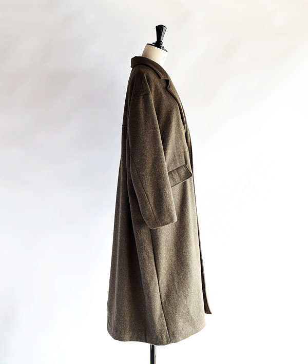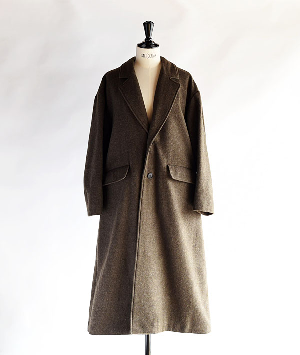 ソフトな肌触りと暖かさが特徴のライトメルトン素材を使用した、オーバーサイズのチェスターコート。ドロップショルダーとバックスタイルのプリーツが特徴で、動きのあるシルエットが魅力。厚手のインナーの上にも気兼ねなく羽織れ、ウール特有の素材感が品の良い印象に仕上がっています。シンプルなデザインとライトな着心地の大人っぽくこなれた雰囲気のアウターです。